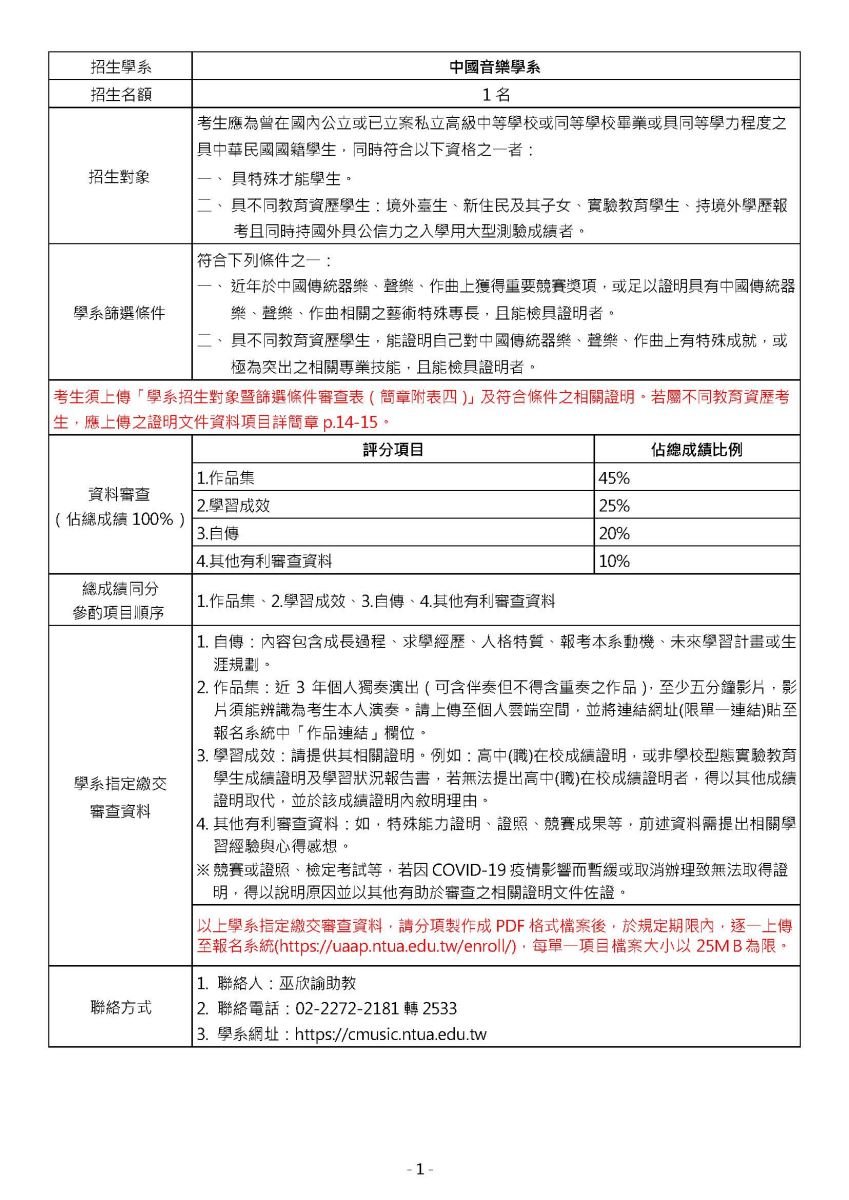 🐾學系篩選條件:符合下列條件之一: ㇐、 近年於中國傳統器樂、聲樂、作曲上獲得重要競賽獎項,或足以證明具有中國傳統 器樂、聲樂、作曲相關之藝術特殊專⾧,且能檢具證明者。 二、 具不同教育資歷學生,能證明自己對中國傳統器樂、聲樂、作曲上有特殊成就,或 極為突出之相關專業技能,且能檢具證明者。
