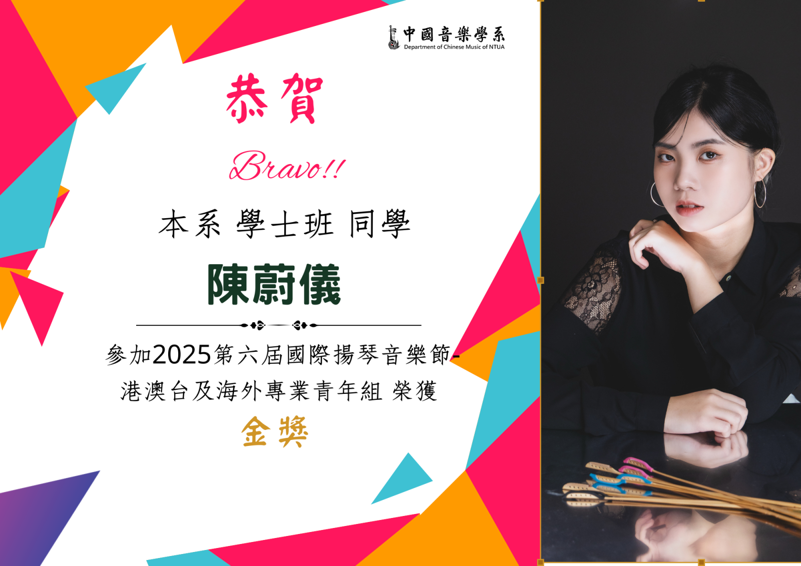 賀!本系學士班陳蔚儀同學,參加 2025第六屆國際揚琴音樂節-港澳台及海外專業青年組,榮獲金獎