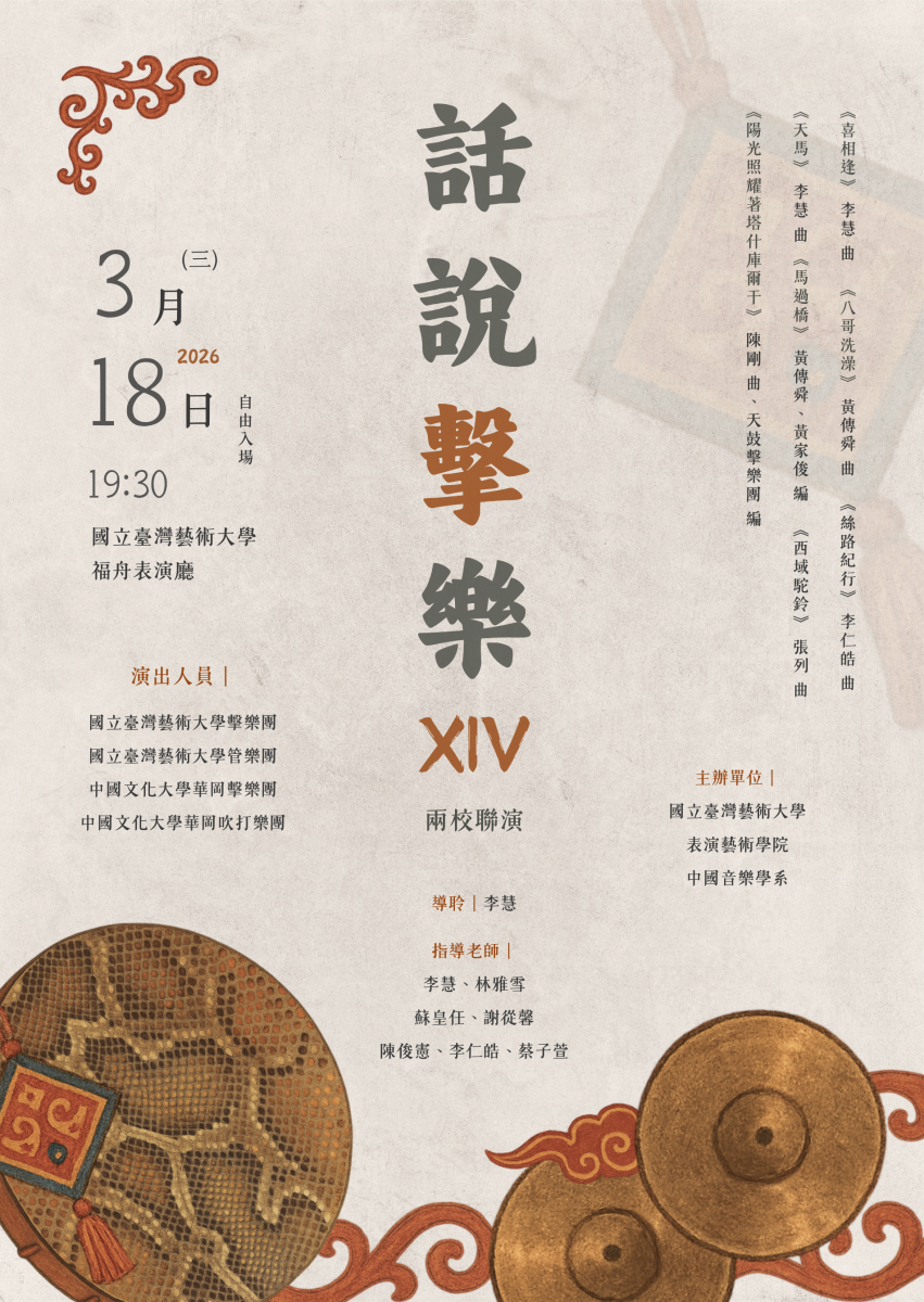 本場節目以新疆與湖南土家族打溜子之素材為主軸,帶領觀眾走入多元民族文化的聲響世界。新疆音樂的奔放豪邁、節奏鮮明,洋溢草原與絲路風情;土家族打溜子常見於傳統儀式與節慶場合,層次豐富的鑼鼓語彙與強烈節奏,紛紛展現濃厚的地方特色。 音樂會除了由本校中國音樂學系臺藝擊樂團、臺藝管樂團擔綱演出外,特別邀請中國文化大學華岡擊樂團、華岡吹打樂團共同參與,透過兩校同學的攜手合作,在彼此觀摩與切磋交流之中,不僅拓展彼此演奏視野,也深化對打擊樂的理解與詮釋能力,展現同學的熱情與能力。誠摯邀請您3月18日蒞臨臺藝大福舟表演廳,在鼓聲與鑼響之間,共同見證打擊樂的多彩風華。