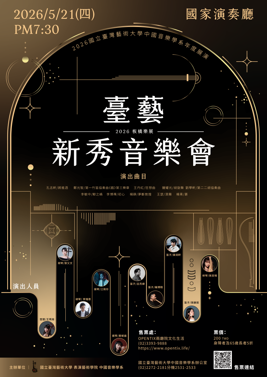 各類樂器新秀演奏家,期盼展現本系學生優異的學習成果,節目精彩可期!