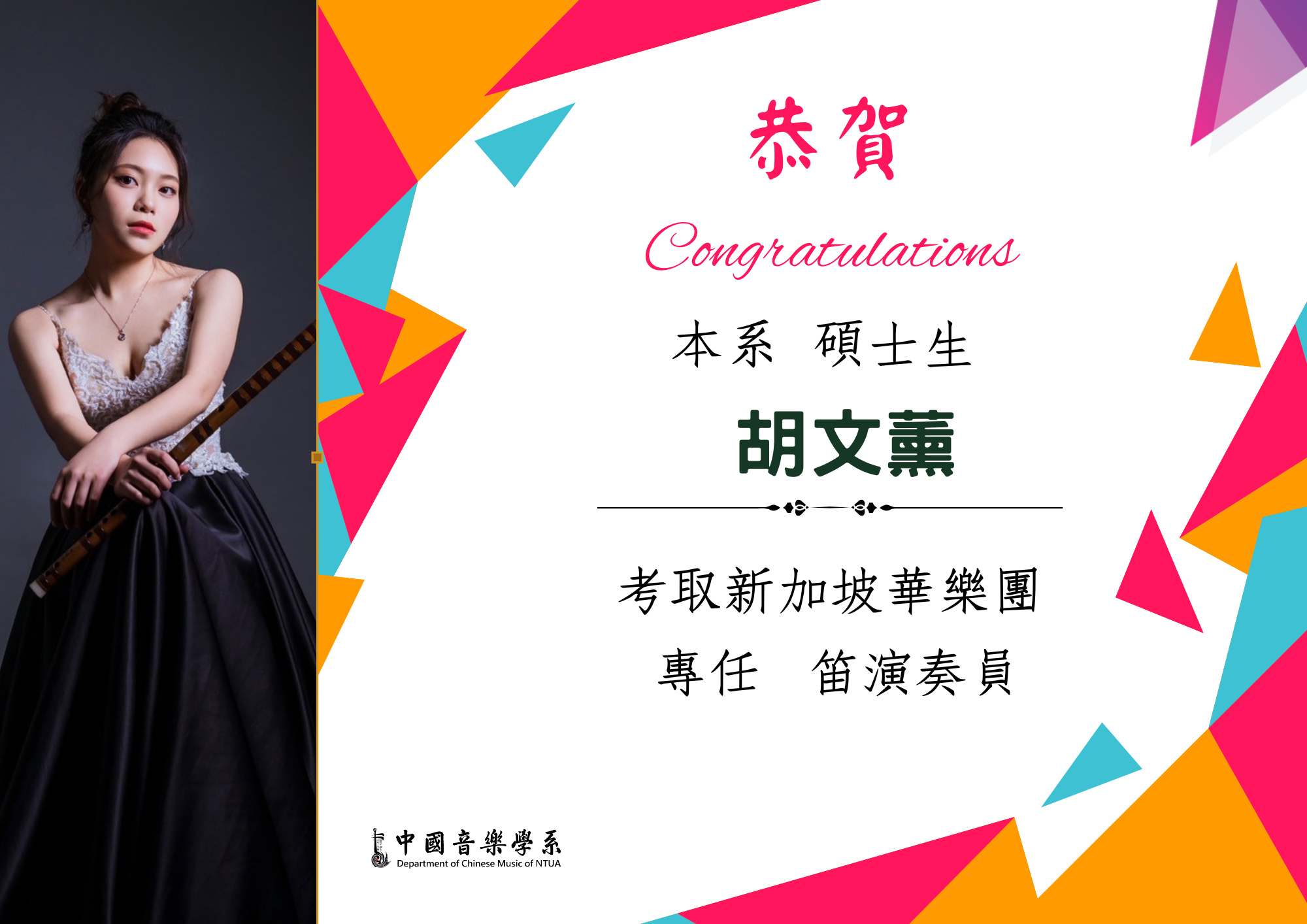 恭賀!本系碩士生胡文薰同學考取新加坡華樂團專任笛演奏員